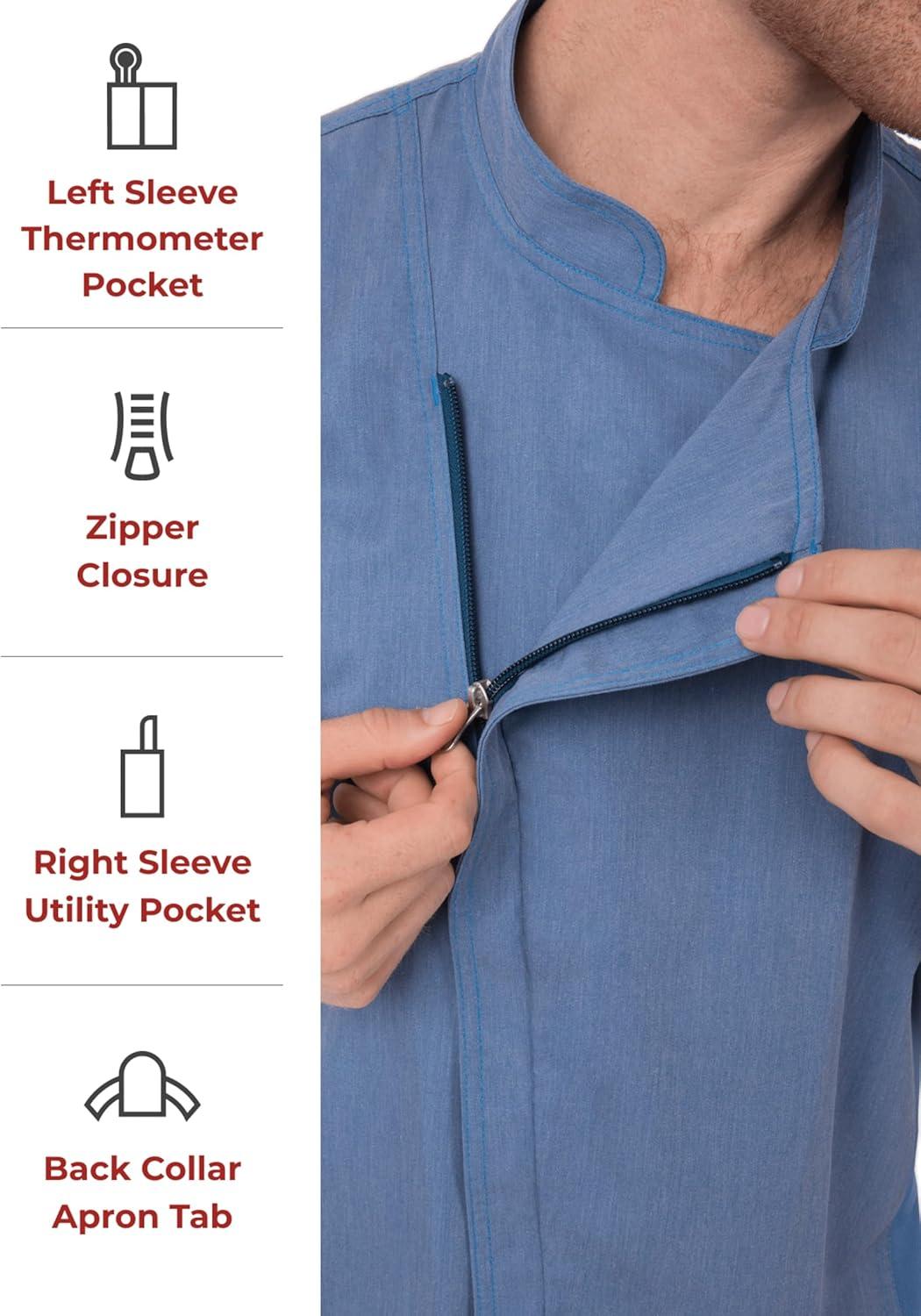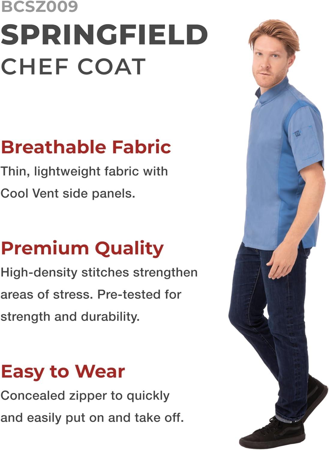 This Springfield Chef Coat is offered with custom embroidery. Mens Springfield Chef Coat features a short-sleeve, single-breasted design with a two-way separating zipper,”lite” twill fabric with Cool Vent sides, a back collar apron holder and two functional pockets. Available in black and white.