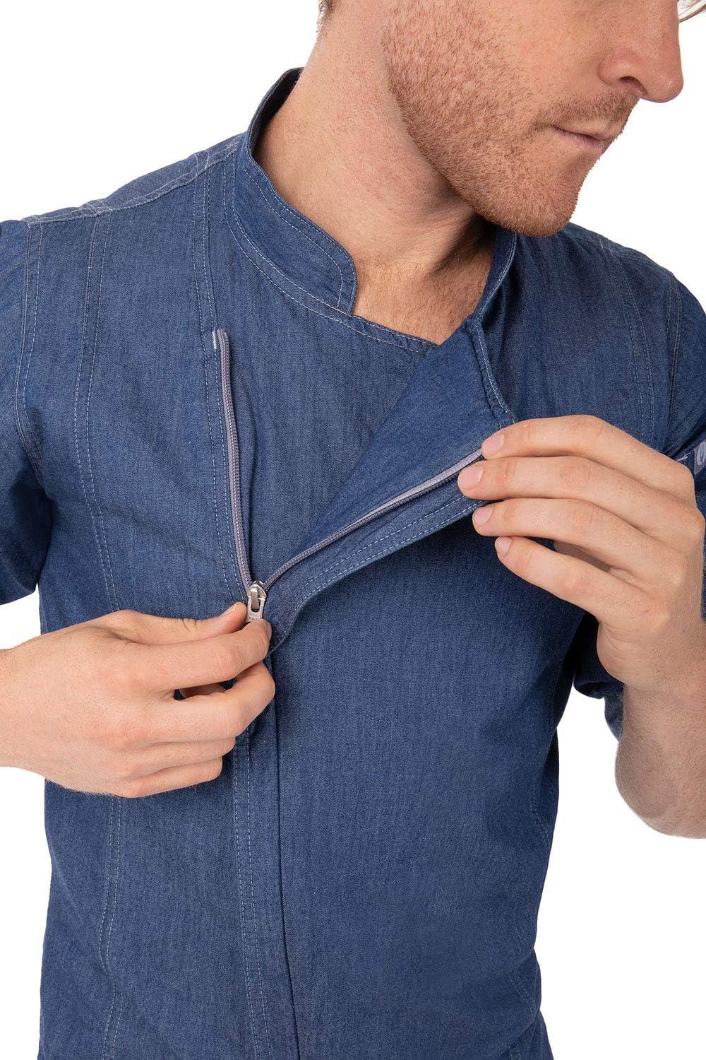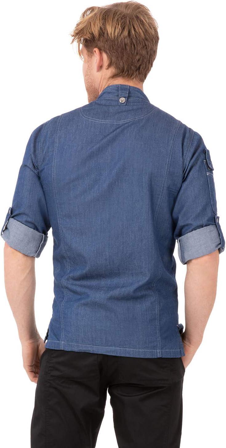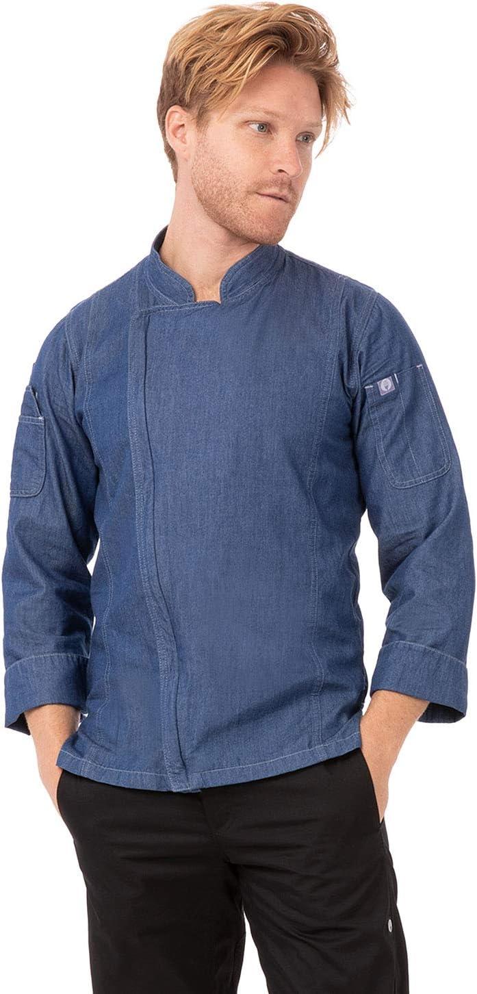 This Gramercy Denim Chef Coat is offered with custom embroidery. The Gramercy Chef Coat is lightweight and decked out with features like dual sleeve pockets, hidden earbud access, and a two-way zipper. The new modern fit delivers a more tailored look and feel.