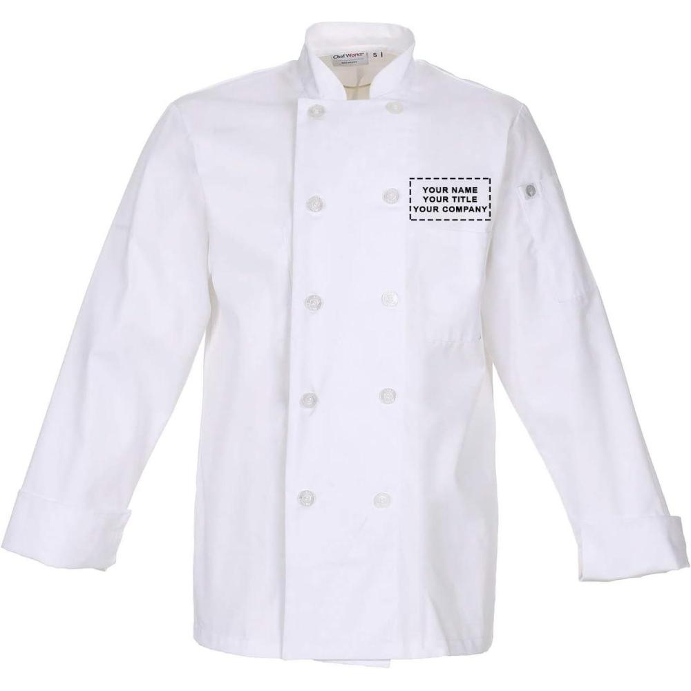 This Le Mans Chef Coat is offered with custom embroidery. Our Le Mans Double-breasted chef coat features soft 6.2 oz. poly/cotton fabric with pearl buttons, turned-back cuffs, left patch and thermometer pockets.