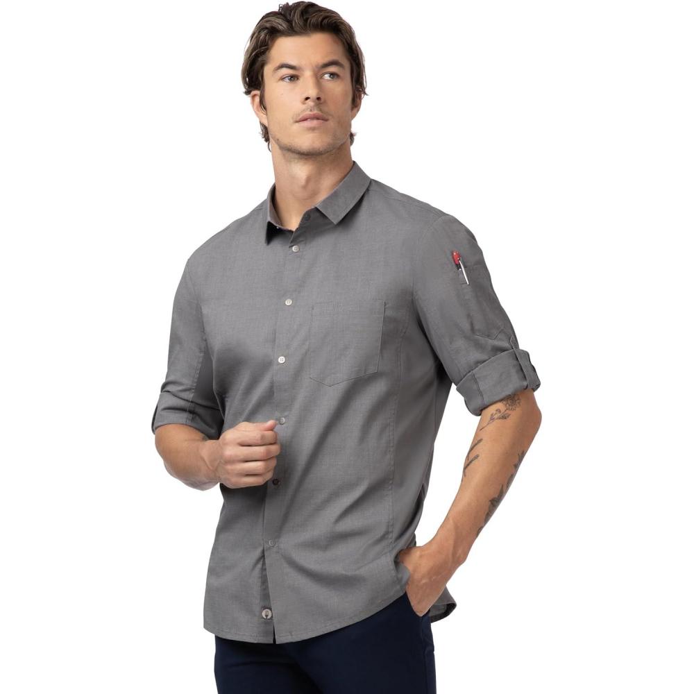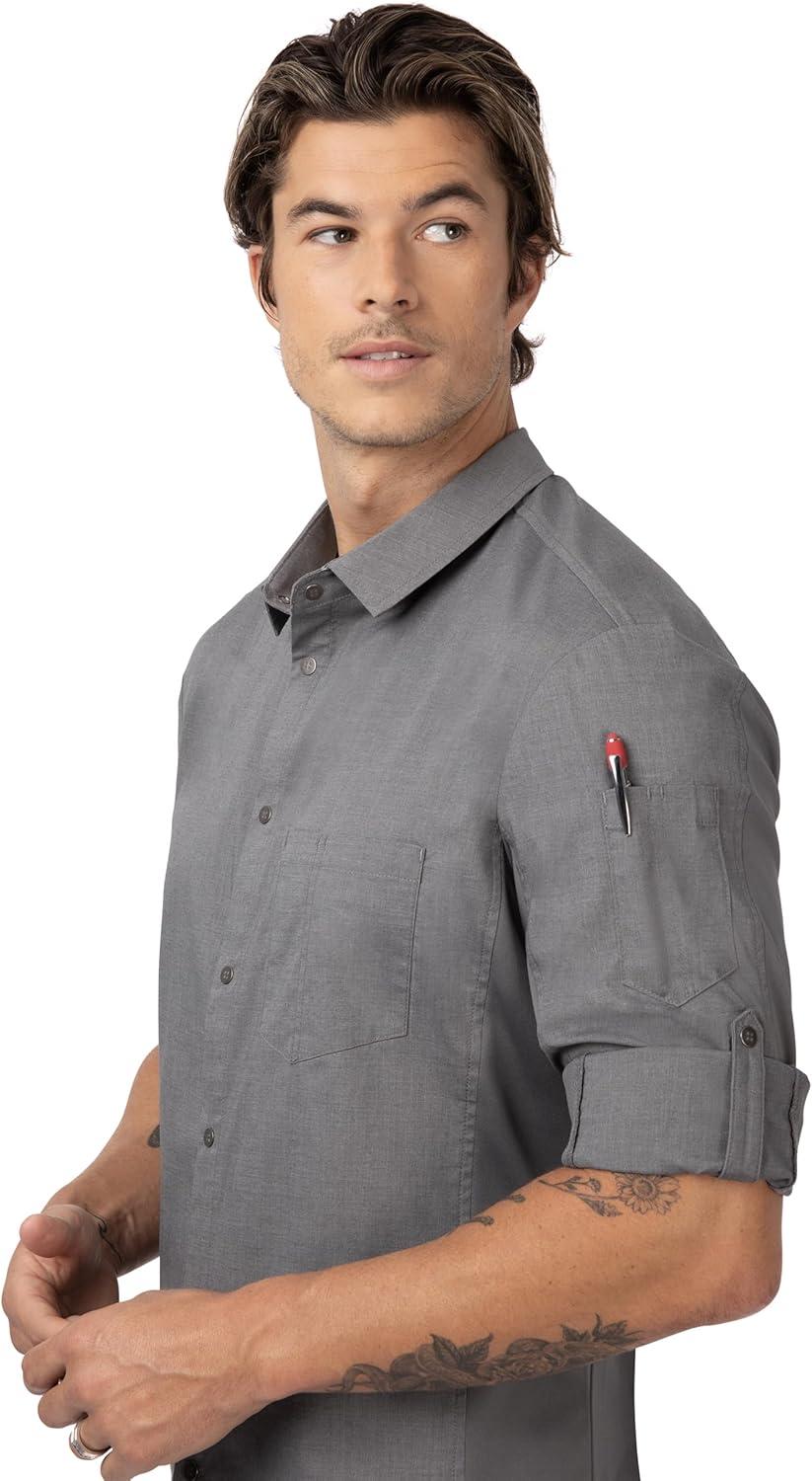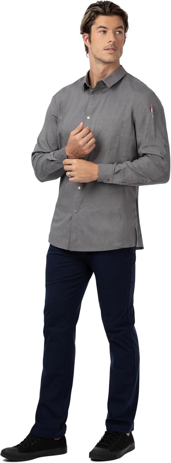 Make a statement in the front-of-house or back-of-house with Chef Works Men's Seville Shirt. This shirt is made from stretch fabric that keeps you cool no matter what the day brings, featuring Cool Vent side panels for breathability and comfort. Plus, it has a front pocket with a pencil divide and left sleeve thermometer pocket for added convenience. Choose between black, blue, gray, and white to suit your style.