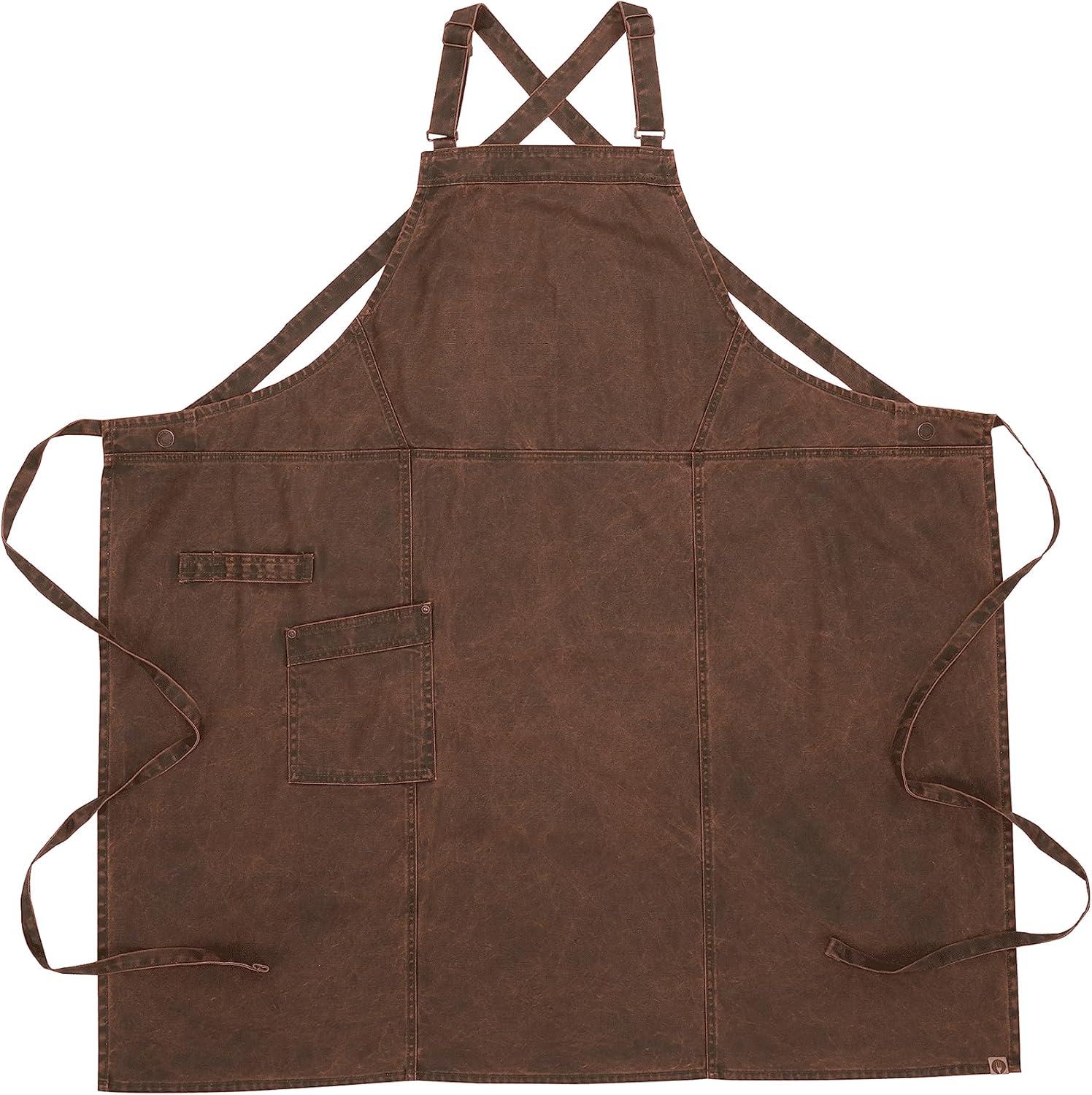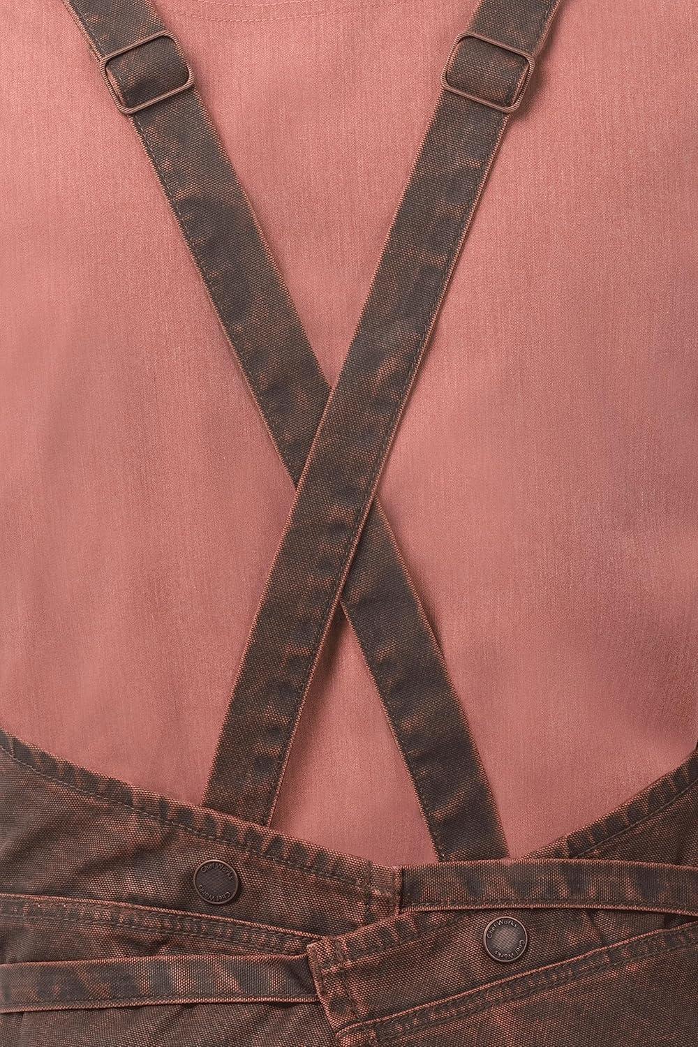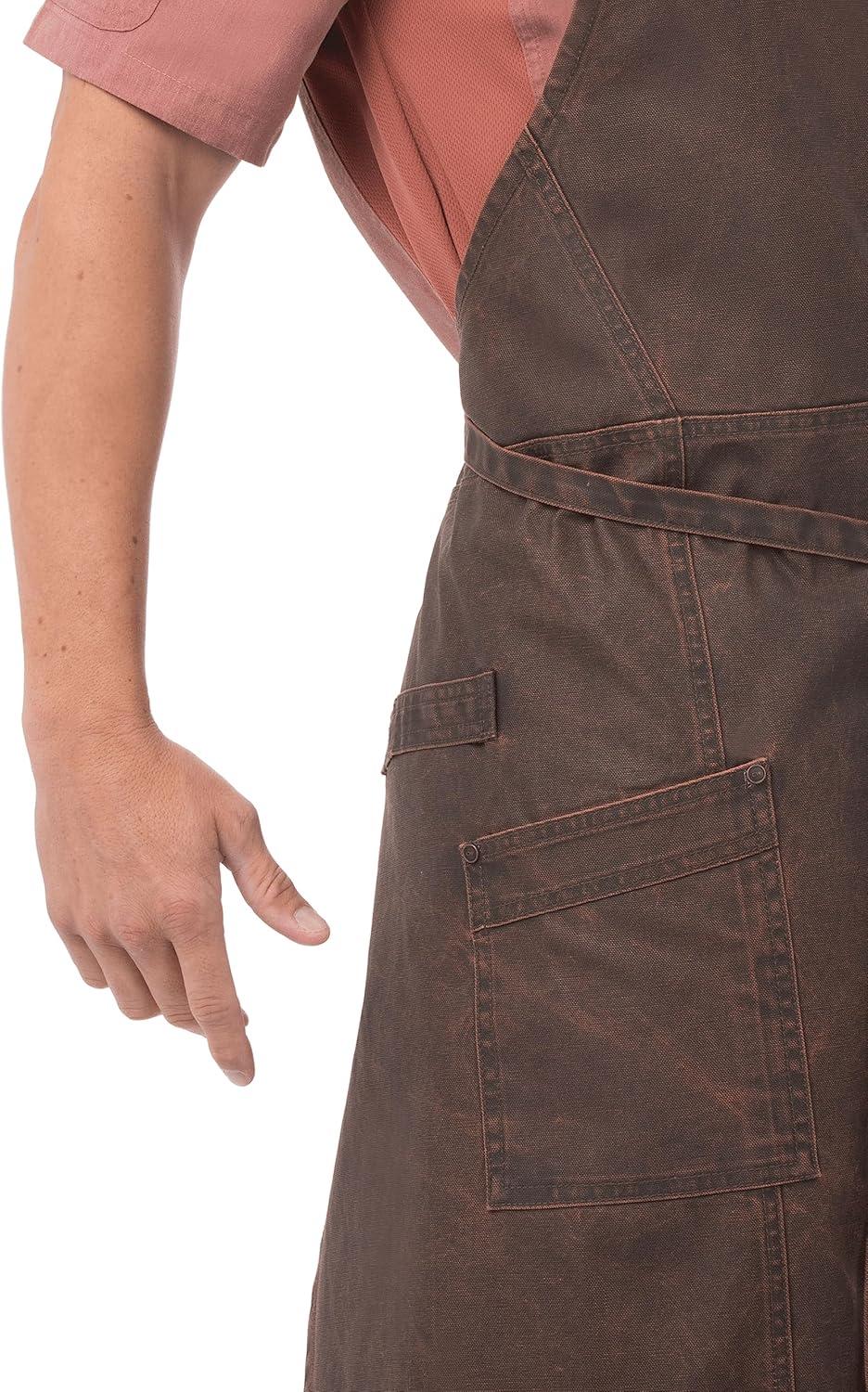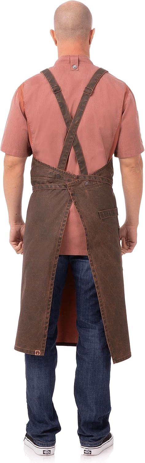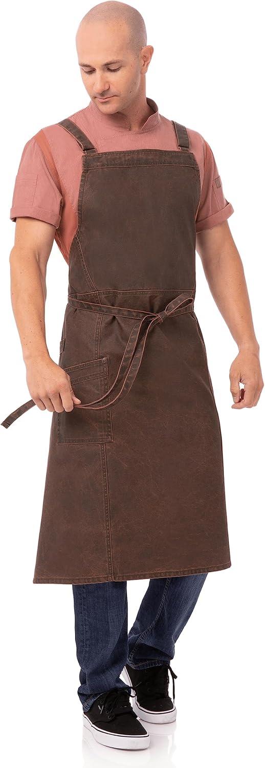 Cut longer and wider than our traditional bib aprons, our denver he bib apron is made from 100 percent cotton and offered in two unique colors with artisan finishes. With adjustable cross-back straps that connect in back, the denver alleviates stress from the neck and prevents apron bunching, so chefs are well equipped to forge their own path in the kitchen. A right-hand cell phone pocket features riveted ends, while reinforced stressed points and double-needle stitching round out this exec-level ensemble.