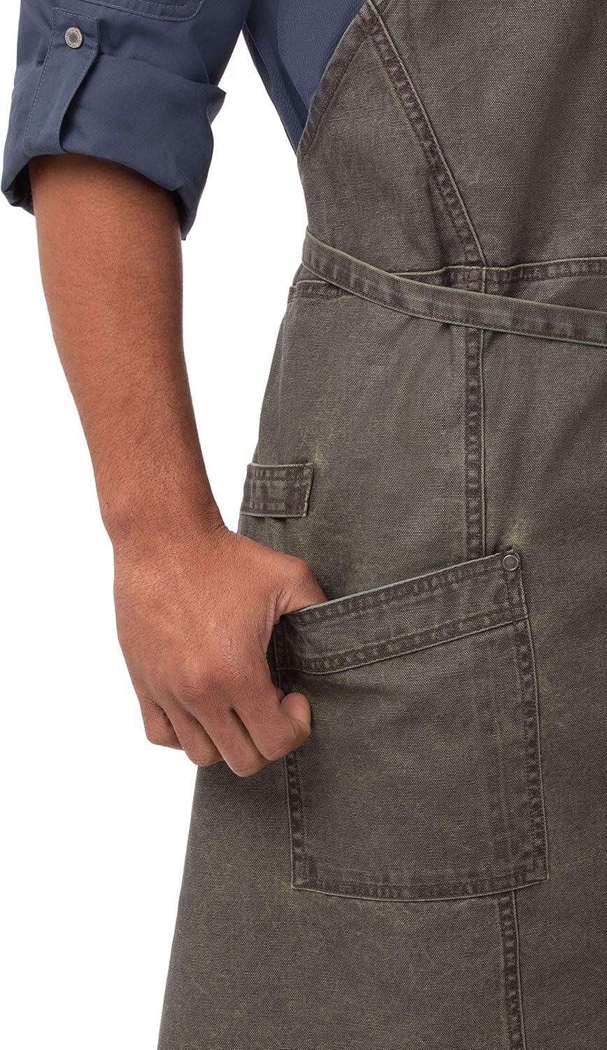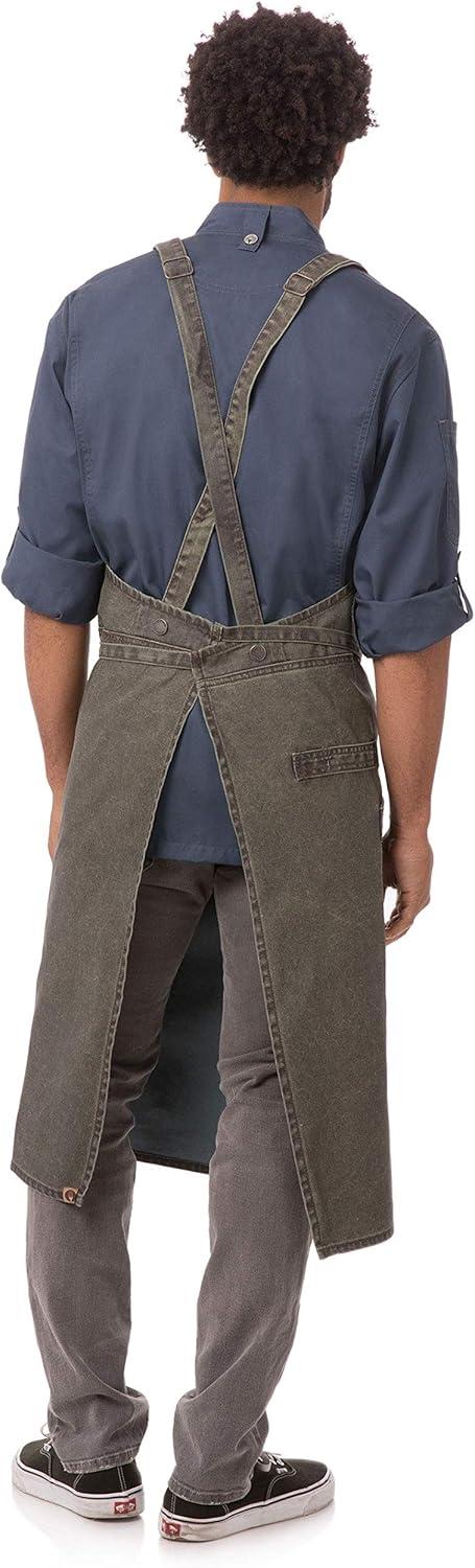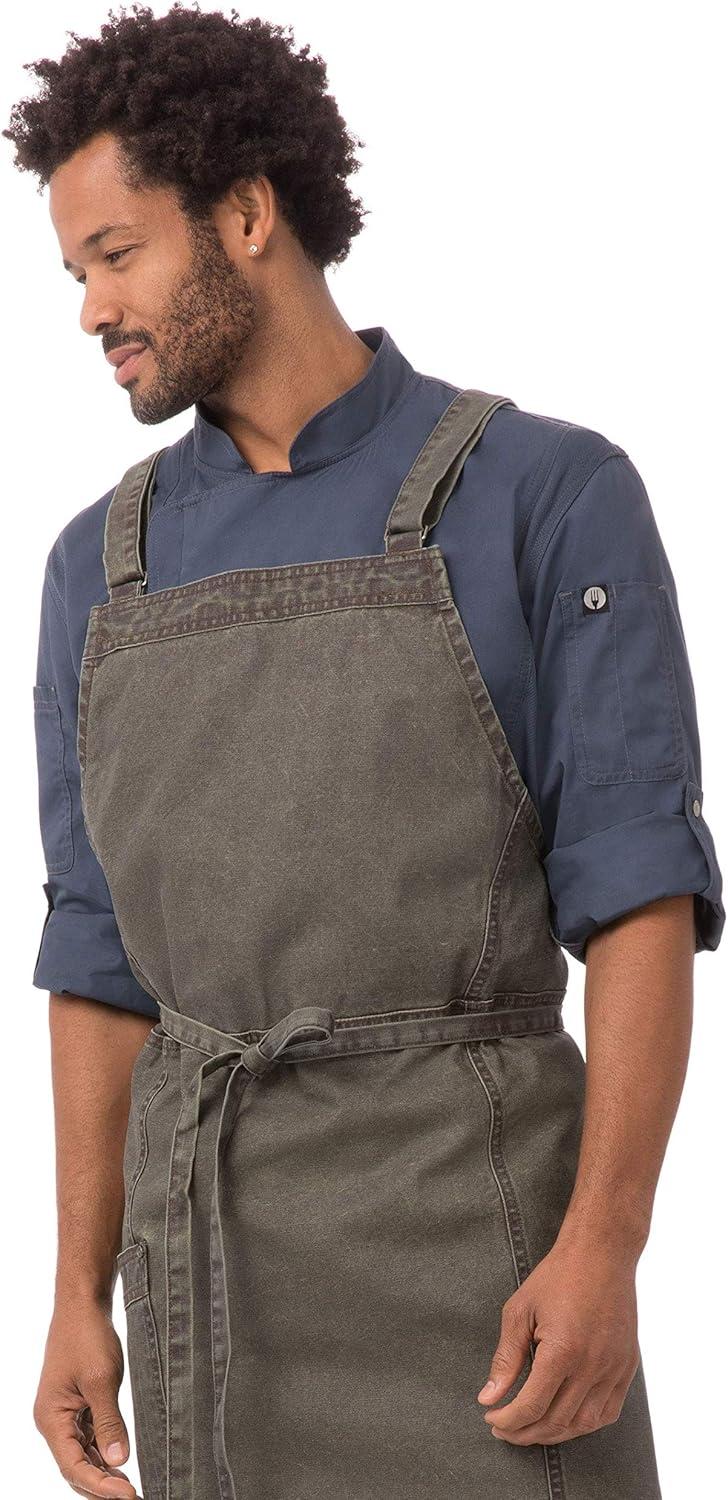 Cut longer and wider than our traditional bib aprons, our denver he bib apron is made from 100 percent cotton and offered in two unique colors with artisan finishes. With adjustable cross-back straps that connect in back, the denver alleviates stress from the neck and prevents apron bunching, so chefs are well equipped to forge their own path in the kitchen. A right-hand cell phone pocket features riveted ends, while reinforced stressed points and double-needle stitching round out this exec-level ensemble.